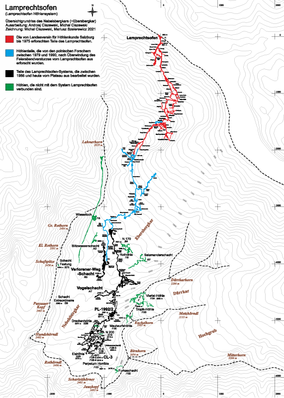 Bis heute sind mehr als 60 km und fast 2000 Höhenmeter des Lamprechtsofensystems erforscht. Es fanden über die Jahre äußerst schwierige und internationale Expeditionen statt, aber erst 1998 gelang es, eine Verbindung zwischen dem Höhleneingang im Saalachtal auf 664 Hm und dem „Vogelschacht“ im Ebersbergkar der Leoganger Steinberge zu finden